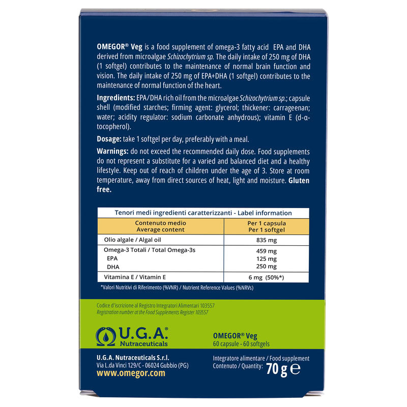 Contenido por 1 cápsula blanda: Aceite de algas: 835 mg; Omega-3 total: 459 mg, de los cuales EPA: 125 mg; DHA: 250 mg; Vitamina E: 6 mg (50% VRN*). *VRN: Valor de Referencia de Nutrientes.