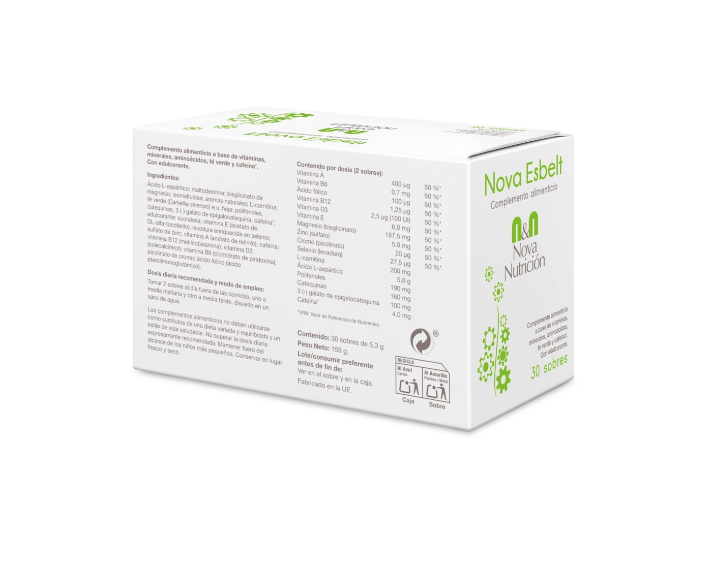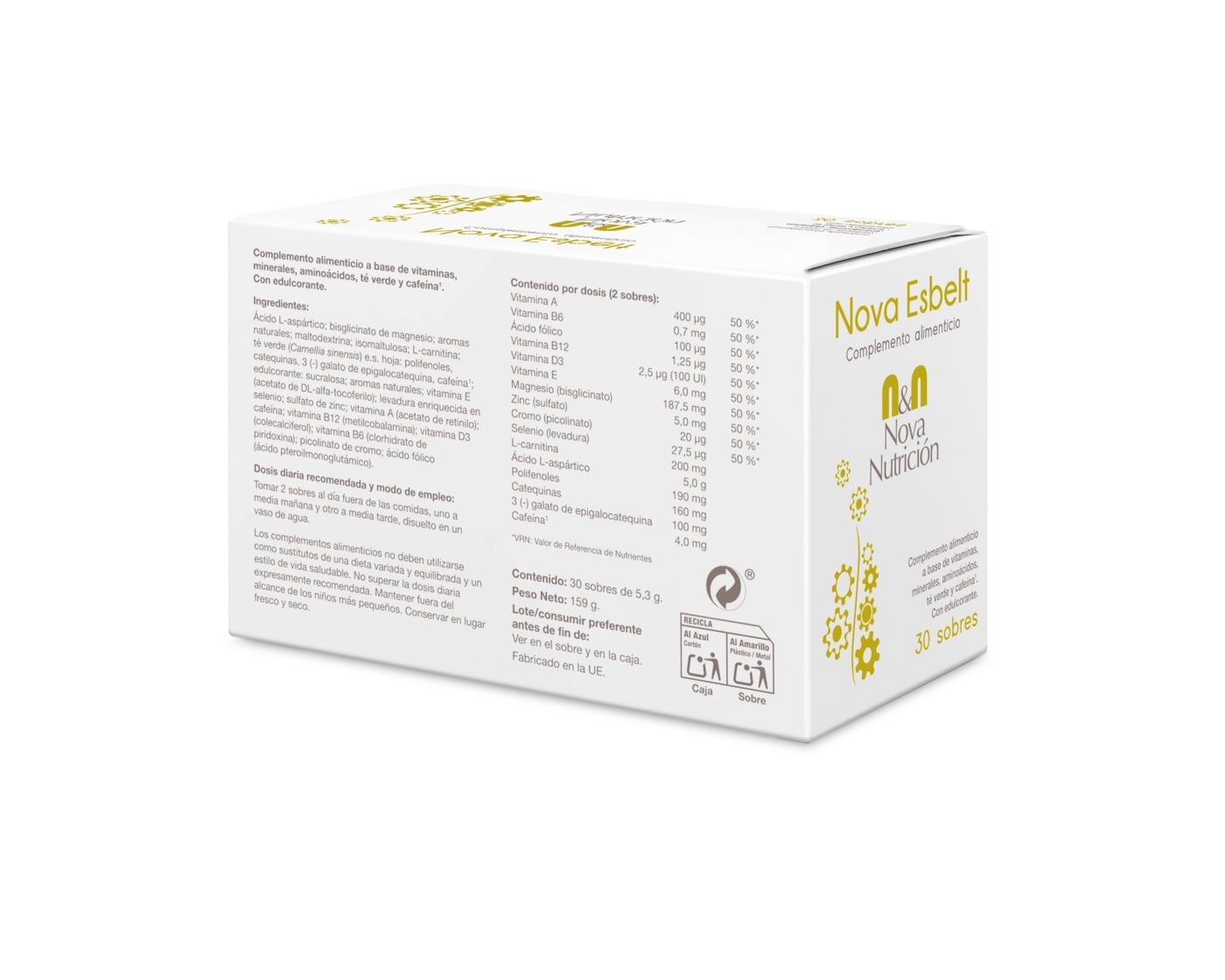 Contenido por dosis (2 sobres): Vitamina A: 400 µg (50 % VRN*); Vitamina B6: 0,7 mg (50 % VRN*); Ácido fólico: 100 µg (50 % VRN*); Vitamina B12 (metilcobalamina): 1,25 µg (50 % VRN*); Vitamina D3 (colecalciferol): 2,5 µg (100 UI) (50 % VRN*); Vitamina E: 6 mg (50 % VRN*); Magnesio (bisglicinato): 187,5 mg (50 % VRN*); Zinc: 5 mg (50 % VRN*); Cromo (picolinato): 20 µg (50 % VRN*); Selenio (levadura): 27,5 µg (50 % VRN*); L-carnitina: 200 mg; Ácido L-aspártico: 5 g; Polifenoles: 190 mg; Catequinas: 160 mg; Epigalocatequina Galato (EGCG): 100 mg; Cafeína: 4 mg.