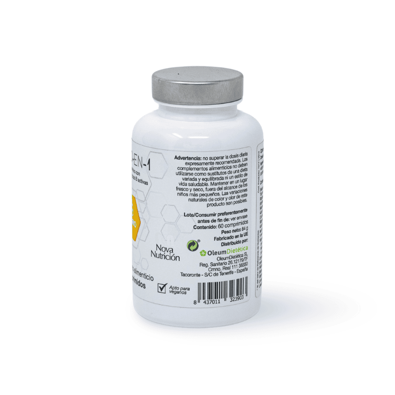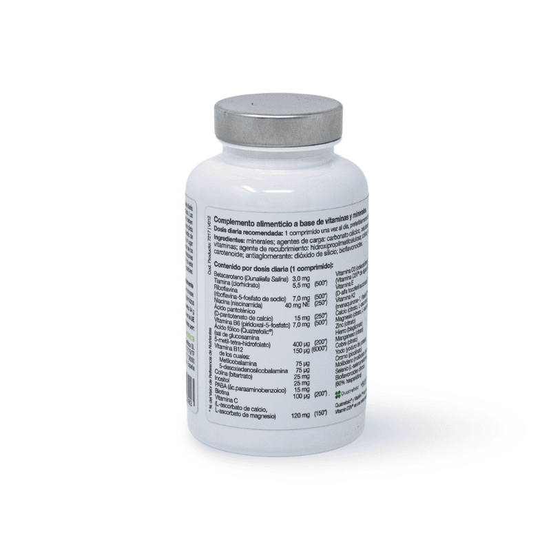 Principios activos: Vitamina B8 (inositol), Ácido para-amino benzoico (PABA), Bioflavonoides cítricos, Betacaroteno, vitaminas B1-B12, C, D3, E, K2, Magnesio, Calcio, Manganeso, Zinc, Hierro, Yodo, Cromo, Cobre, Molibdeno, Selenio.