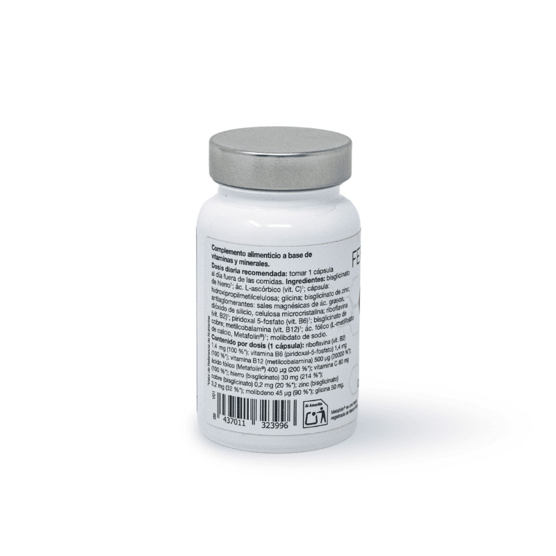 Principios activos: Hierro, Vitamina C (ácido ascórbico), Glicina, Zinc, Vitamina B2 (riboflavina), Vitamina B6 (piridoxina), Cobre, Vitamina B12 (cobalamina), Vitamina B9 (ácido fólico). Combinación para soporte nutricional.