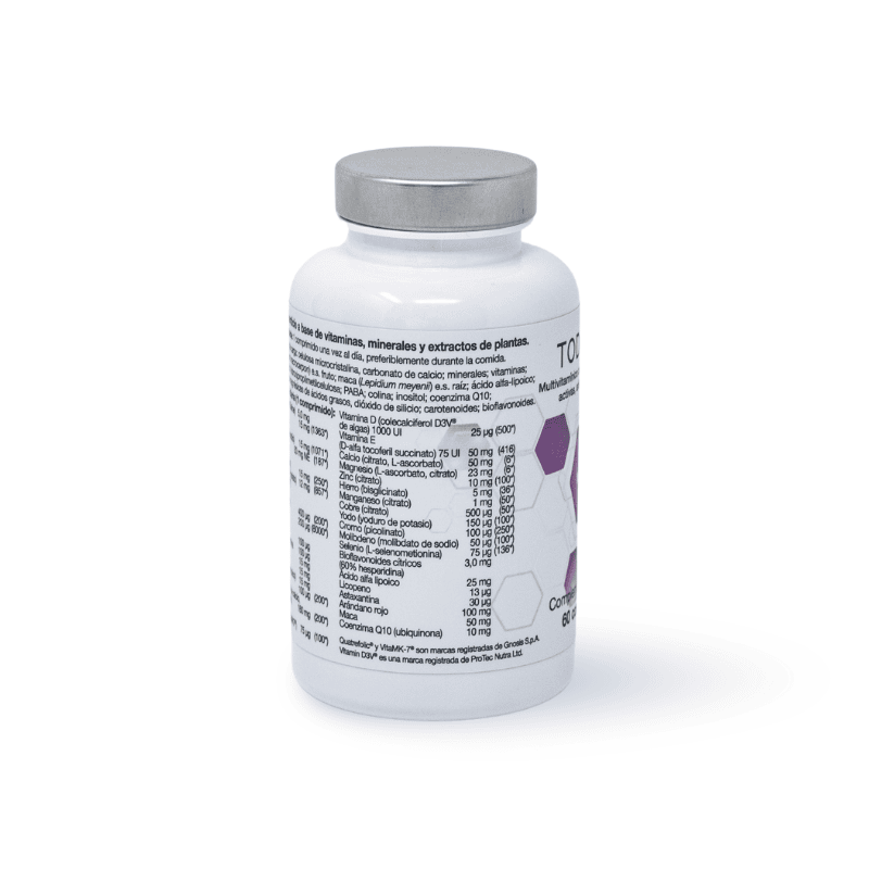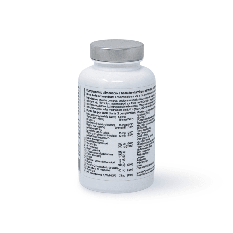 Principios activos: Betacaroteno, vitaminas B1-B12, C, K2, D3, E, minerales, ácido alfa-lipoico, bioflavonoides, astaxantina, coenzima Q10, arándano rojo, maca.